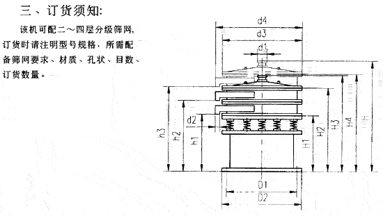 型 號 篩網直徑 (mm) 處理量 (T / h) 振動頻率 (min-1) 電機功率 (kw) 重量 (kg) 備 注 GD — 1500 ¢ 1500 9 — 14 930 2.2 759 處理量按標準物料河砂計算 (1.67/m3) 選型時按處理物料比 重換算 GD — 1000 ¢ 1000 4 — 6 930 1.I 500 GD — 800 ¢ 800 2 — 4 930 0.75 40 GD — 600 ¢ 600 1.5 — 2 1450 0.75 300 GD — 400 ¢ 400 1 — 1.5 1450 0.25 160